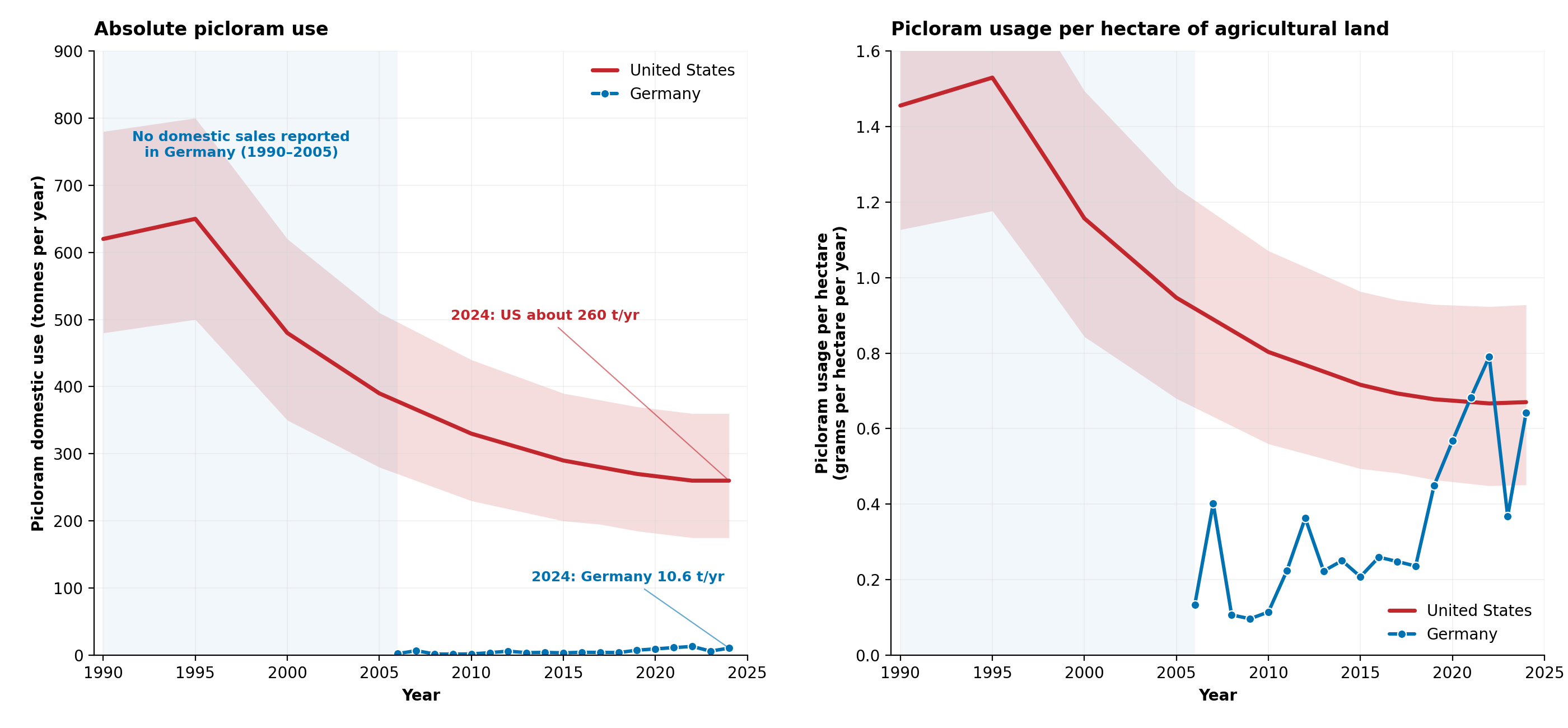 Disclaimer: The US picloram values shown in the figure are reconstructed from a small number of historical anchor estimates plus a partial USGS time series, and the year-to-year shape between anchors is interpolation, not measurement. The German BVL table reports domestic sales, which is not the same as total exposure (food residues, imported products, and any non-reported use are not captured). The Tanaka cohort covers five of sixteen German federal states plus the Münster region. The Maas et al. discovery cohort is small. None of this is a definitive evaluation of the Maas paper. This article is not medical advice.