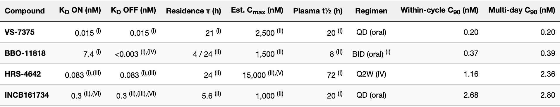 The simulation suggests a mechanistic sketch of the four non-covalent compounds. If the symmetric-KD reading holds, VS-7375 behaves as a balanced dual ON/OFF reversible binder with low-picomolar affinity and long residence, at the extreme end of the published range for this class. BBO-11818 appears to operate as an asymmetric binder that trades ON-state affinity for an extraordinary OFF trap, a tradeoff that looks close to cost-neutral on a C90 basis under the exchange-ratchet assumption, with pan-KRAS activity (strongest for G12D, G12C, and G12A; moderate for G12V, G12S, and G13D; negligible for G12R and Q61 variants) as a secondary feature. HRS-4642 looks like a conventional dual binder with published sub-nanomolar affinity. Under its Q2W clinical regimen, IV dosing and a liposomal formulation that reduces the free-drug fraction likely handicap its multi-day performance relative to oral compounds, though the degree of handicap depends on parameters not yet published. INCB161734 is described only in qualitative terms by its sponsor, and its modeled position rests on a single KD assumption that may understate true affinity.
