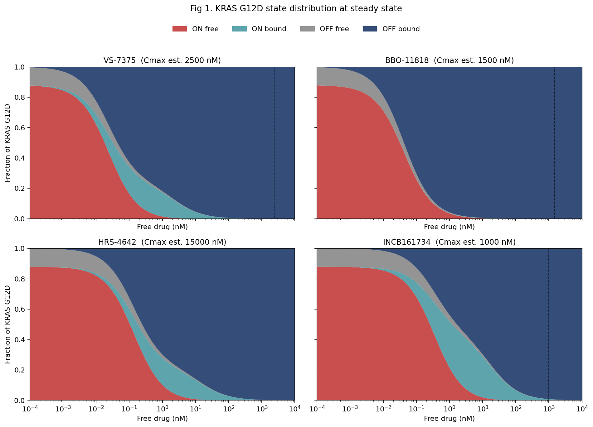 VS-7375 drives the population into the drug-bound OFF state starting in the low-picomolar range. HRS-4642 behaves similarly, with the curve shifted rightward consistent with its higher KD. INCB161734 sits further right still. BBO-11818 shows the most striking pattern: despite having by far the weakest ON-state KD at 7.4 nM, it produces near-complete OFF-bound accumulation at single-digit nanomolar concentrations. The reason is that its OFF-state pocket is so deep that any molecule reaching the OFF state is effectively trapped. The ON-bound intermediate prominent in the VS-7375 panel is almost absent here, because molecules that do bind ON migrate directly into an OFF-state pocket more than 2,000-fold tighter the moment they hydrolyze.