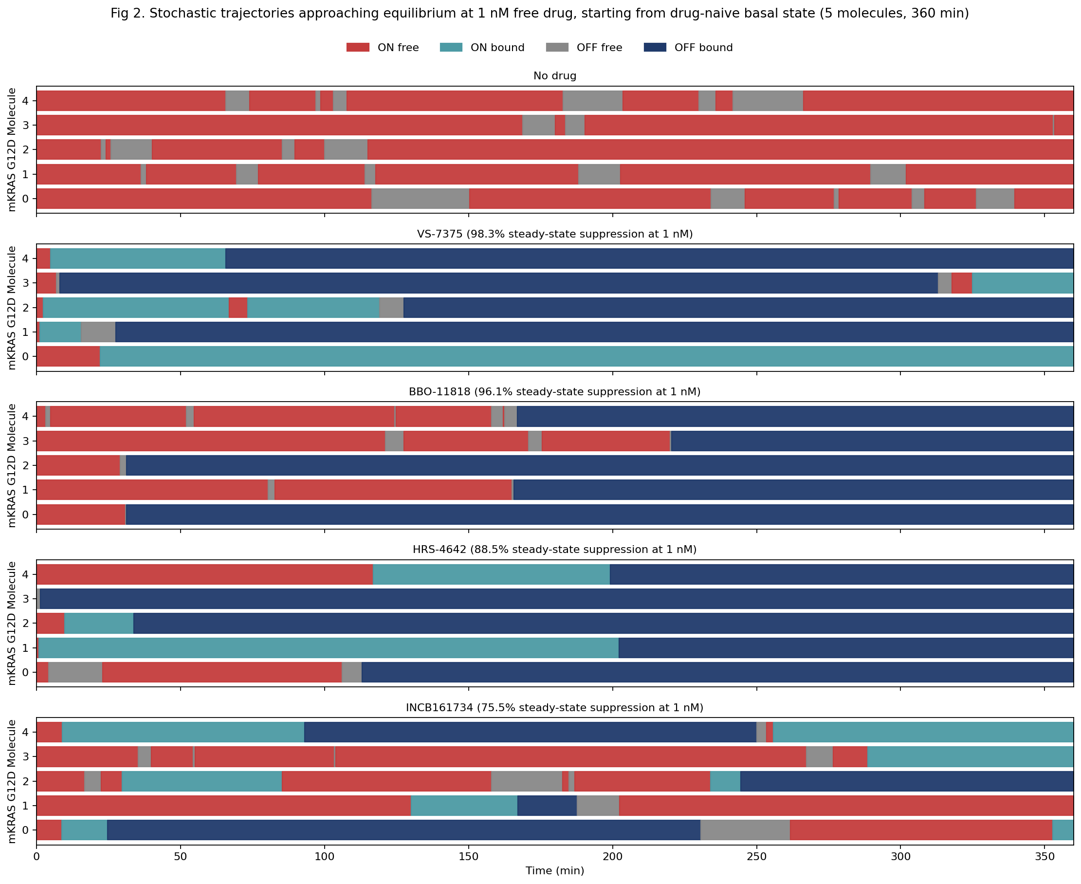 Figure 2 shows Gillespie stochastic simulations at a common free drug concentration of 1 nM, tracking five individual KRAS G12D molecules per panel over a six-hour window. Holding concentration constant across compounds isolates mechanism from exposure.