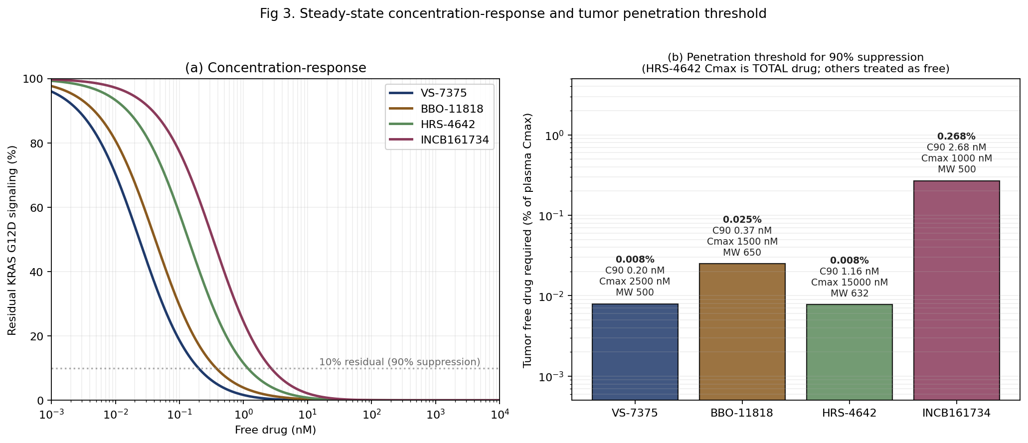 VS-7375 and HRS-4642 both require only about 0.008% of plasma free drug to reach the tumor for 90% suppression. BBO-11818 requires about 0.025%. INCB161734 sits more than an order of magnitude above the lowest pair at 0.27%, driven by a lower Cmax combined with a higher C90. The HRS-4642 number is doubly optimistic: its Cmax is a murine cross-species proxy (Zhou et al., 2024), and it reflects total drug including the majority encapsulated in the liposomal carrier, so the true free-drug penetration threshold in humans is higher than 0.008%. All four numbers rest on the convention, disclosed above, that estimated Cmax values are treated as free drug; published plasma protein binding is not available for any of the four compounds. These numbers are also indifferent to the pancreatic microenvironment, where dense stroma, elevated interstitial pressure, and irregular vasculature can materially reduce free drug availability. Interpretation should be directional, not absolute.