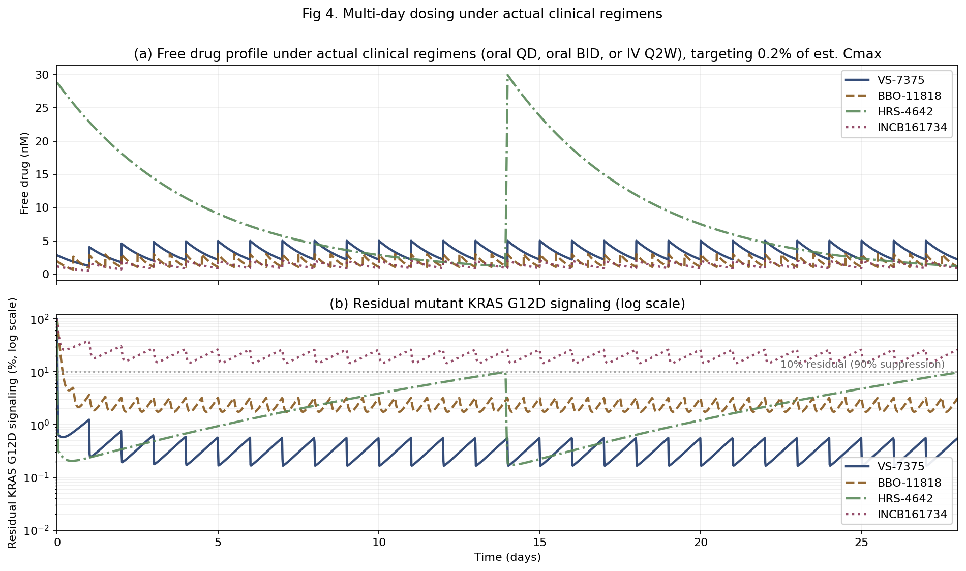 Within-cycle C90 at constant free drug is not the whole picture. Real patients experience pulsatile PK, and a compound's practical performance depends on how well it holds target engagement through dosing troughs. Figure 4 shows a 28-day simulation under each compound's actual clinical regimen and terminal half-life as specified in Table 1: oral QD for VS-7375 and INCB161734, oral BID for BBO-11818, and IV Q2W for HRS-4642. The simulation uses explicit pulsatile PK with dose superposition, so residual drug from prior doses adds to each new dose rather than each interval being treated in isolation. Doses are scaled so the steady-state peak reaches 0.2% of estimated Cmax, a sub-saturating target chosen so that differences between compounds are visible rather than compressed at the ceiling.