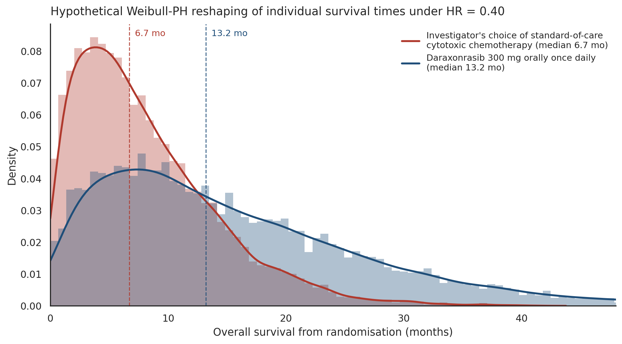 Illustrative Model Disclaimer: The figure in this article is a hypothetical illustration, not a fit to patient-level data. It is a closed-form Weibull proportional-hazards mapping, parameterised by the two reported RASolute 302 topline endpoints (median OS on each arm and the hazard ratio), and is intended only to build intuition for what HR 0.40 implies for the shape of a survival distribution. The simulation code has not been independently audited, peer-reviewed, or verified by a third party. Bugs in the implementation could alter results materially. The model's outputs should be understood as a structurally conservative illustration, not as quantitative predictions of survival on either arm, in any subgroup, or in any individual patient. The model makes no claim about the existence or size of a durable-responder tail, which can only be assessed from the actual Kaplan-Meier curves with longer follow-up.