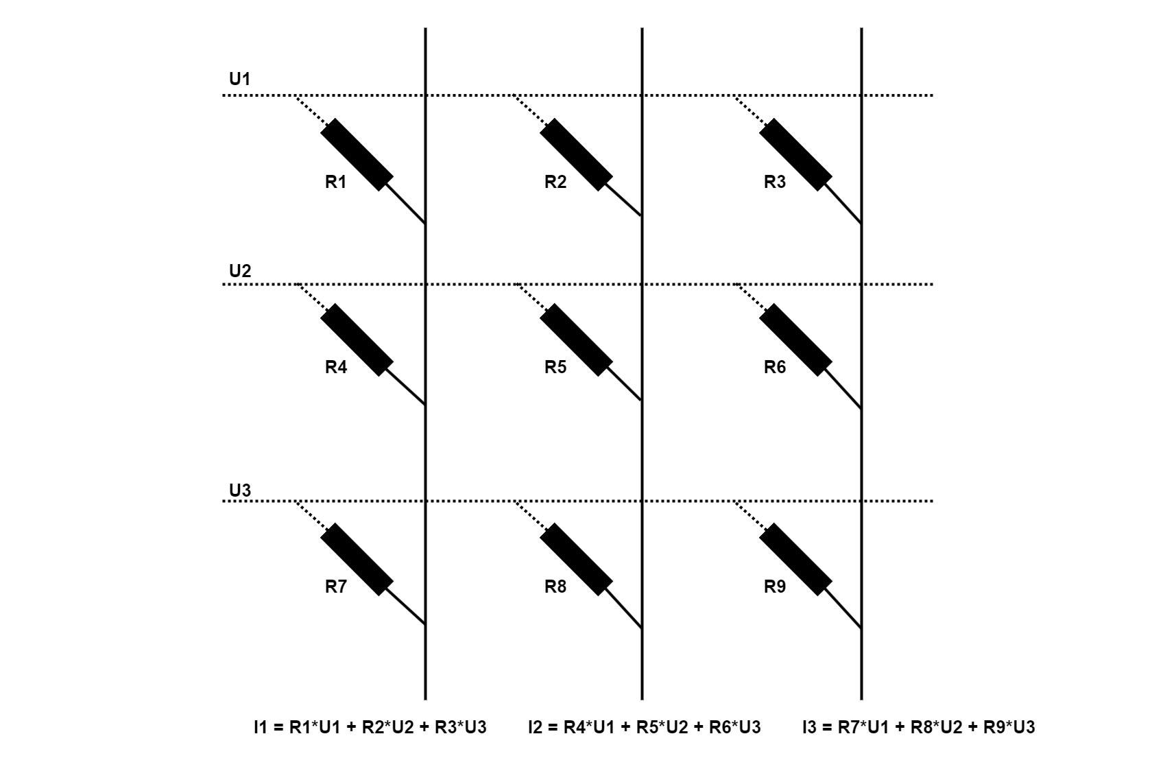 In principle, multiplication and addition can be performed in electronic circuits by exploiting Kirchhoff's circuit laws. This type of analog computation results in much higher power efficiency and can be performed directly in memory, avoiding the von Neumann bottleneck.