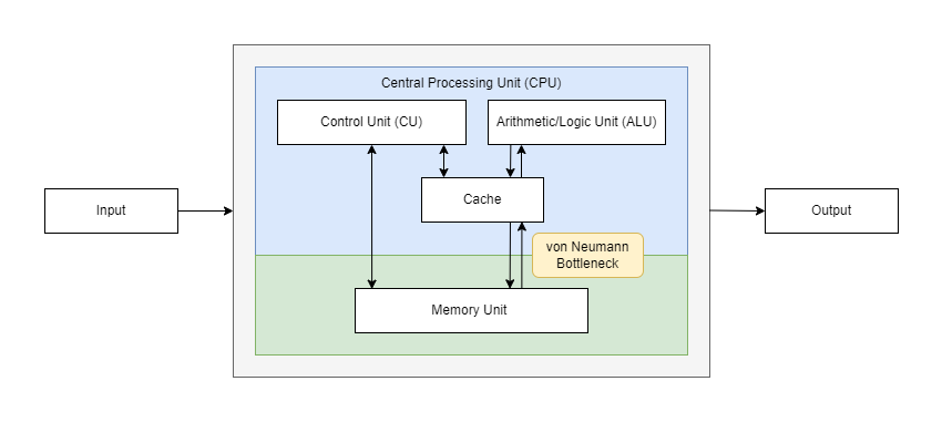 Broken down to the most basic operations, these are multiplication and addition. To perform these operations on numeric values, the data must first be transferred from memory (DRAM) to the arithmetic/logic unit (ALU). For example, if a number is stored as a 64-bit float (see my article on IEEE 754), 1-2nJ of energy is required for the transfer. In addition, there is a limit to the amount of data that can be simultaneously transferred between the processor cache and memory, known as the von Neumann bottleneck.