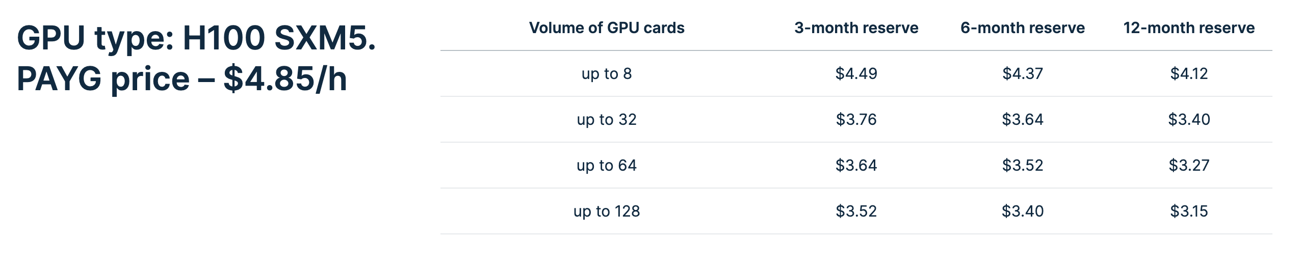 One of NVIDIA’s H100 SXM5 ( up to 3,958 teraFLOPS) costs between $3.15 and $4.49 per hour on-demand at NEBIUS AI, depending on the reservation time and the volume of GPUs used (as of August 1, 2024). In our example, it would make sense to choose the largest volume (up to 128 GPU chips), which would cost between $3.15 and $3.52 per GPU per hour. Let’s assume that we chose the shortest reserve time and therefore the most expensive offering in this category. So a cluster of 128 GPUs would cost about $450 per hour (128 x $3.52) and can compute up to 507 petaFLOPS (128 x 3,958 teraFLOPS). So for $64,400 (actually for $63,980) per hour, we could rent 142 full clusters of 128 H100 SXM5 with a total compute capacity of up to 72 exaFLOPS (142 x 507 petaFLOPS).